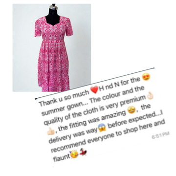 "Thank u so much β€οΈ H nd N for the π summer gown... The colour and the quality of the cloth is very premium ππ»ππ», the fitting was amazing π€©, the delivery was way π± before expected... I recommend everyone to shop here and flaunt ππ"