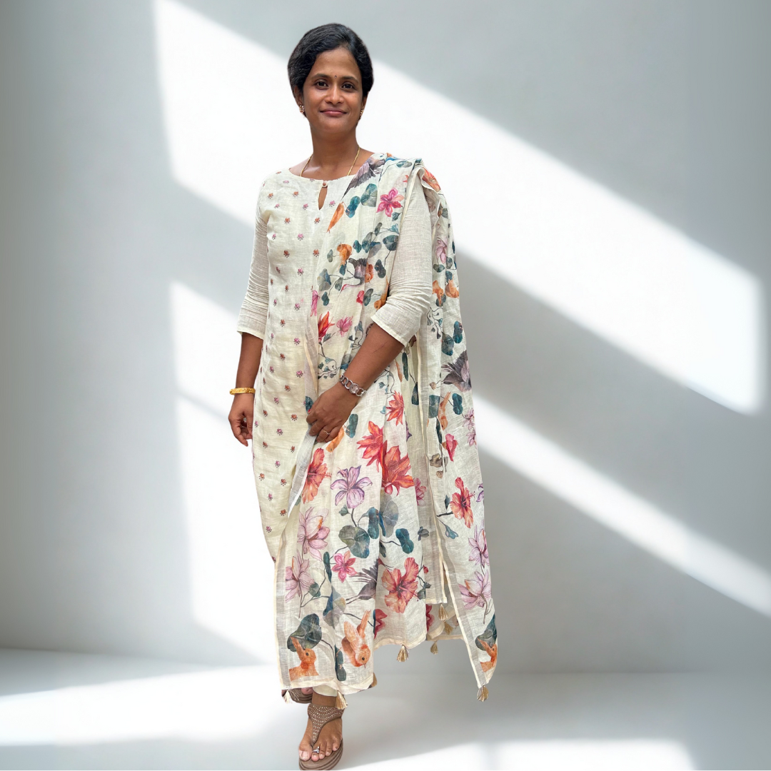 Step into understated elegance with this Ivory Linen Cotton Embroidered Salwar Set, crafted for women...