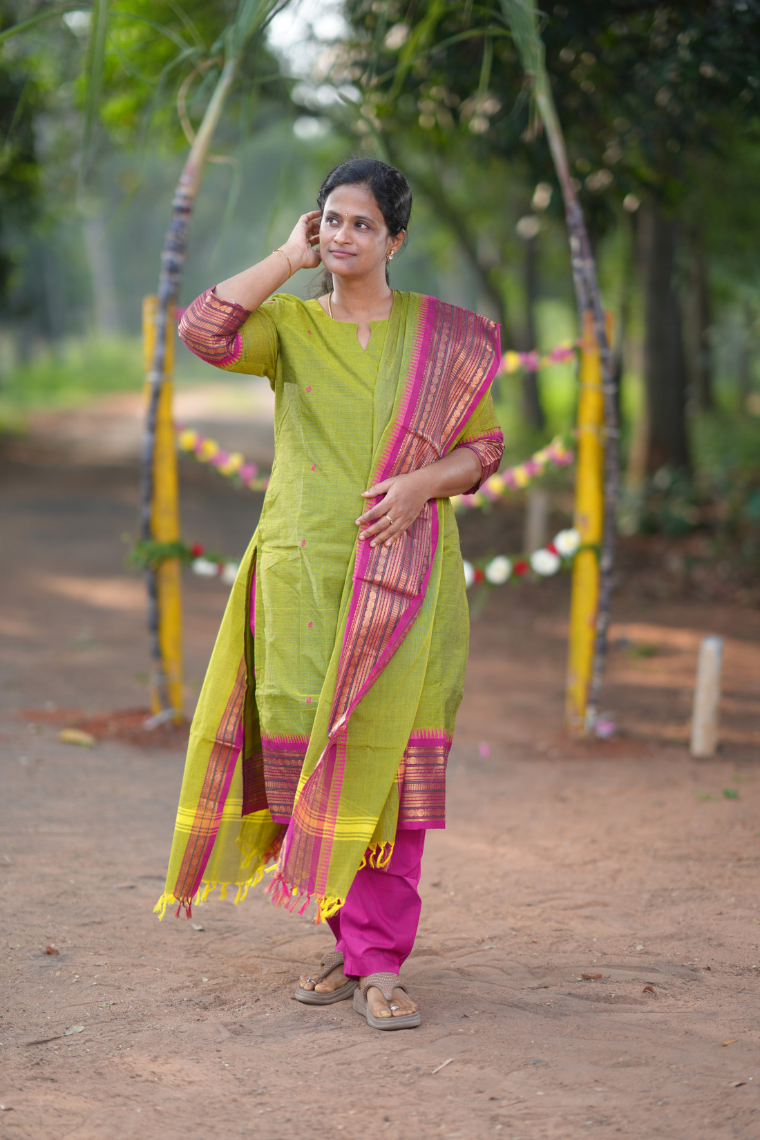 Green Cotton Salwar Set with Festive Pink Temple Border Dupatta