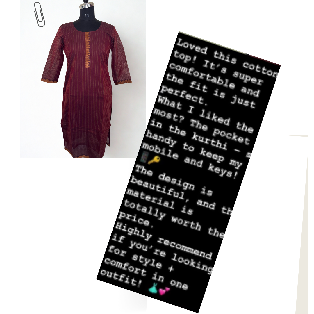 "Loved this cotton top! It's super comfortable and the fit is just perfect. What I liked the most? The pocket in the kurthi β so handy to keep my mobile and keys! πThe design is beautiful, and the material is totally worth the price. Highly recommend if you're looking for style + comfort in one outfit! π«π"