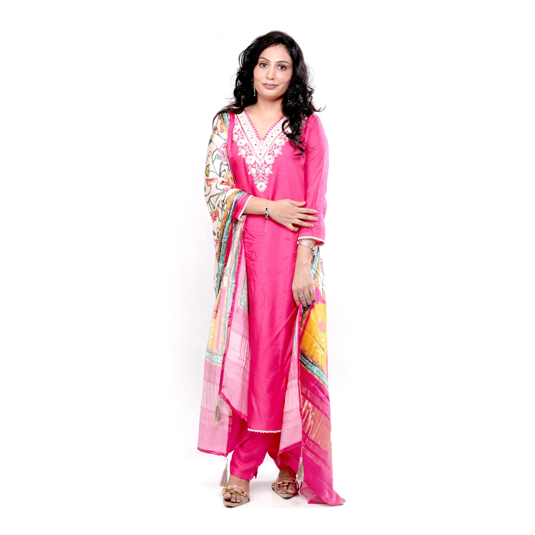 Elevate your wardrobe with this beautiful Printed Cotton Chikankari Dupatta Salwar set. Made from luxurious...