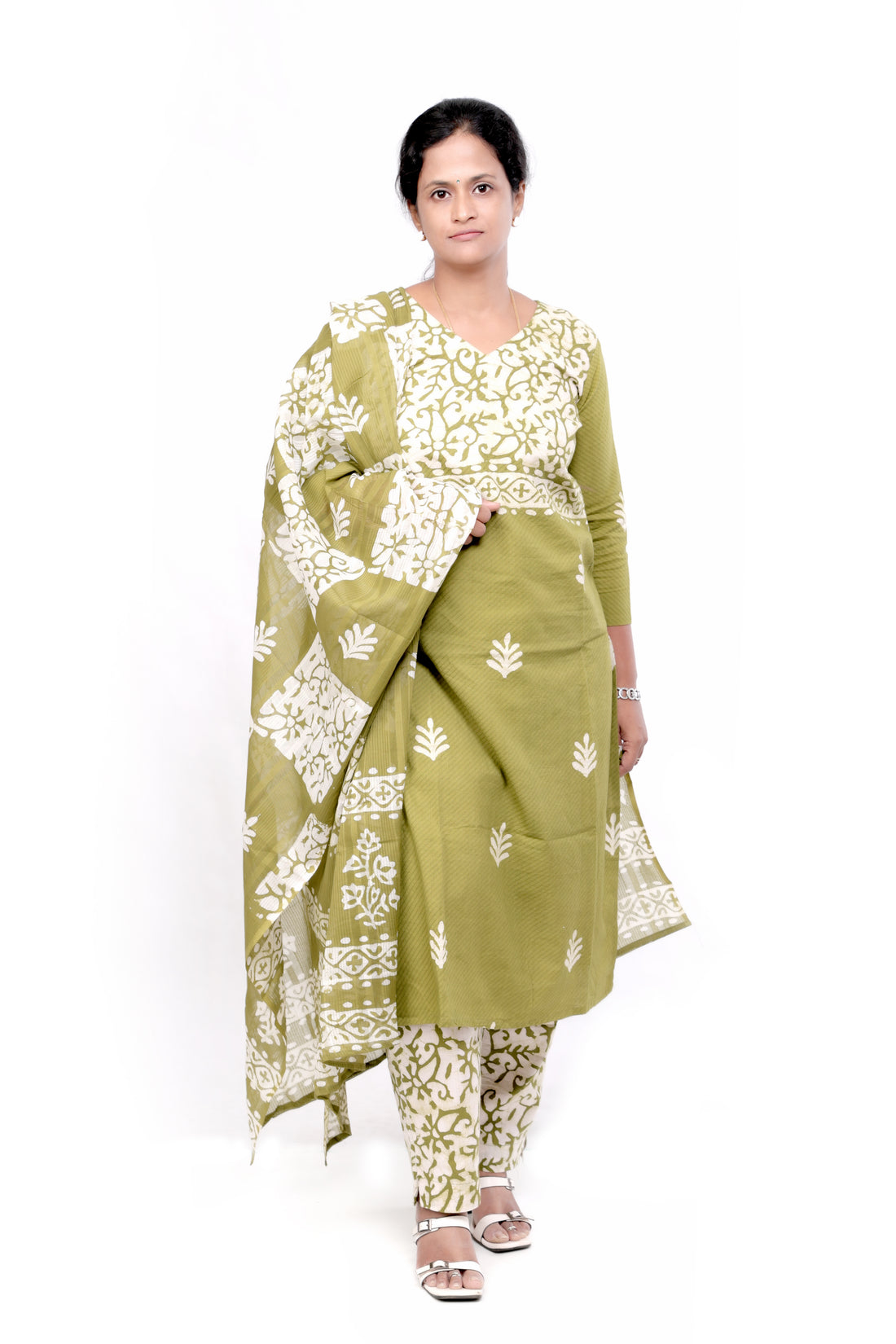 Cotton Silk with Kalamkari Dupatta - Olive Green