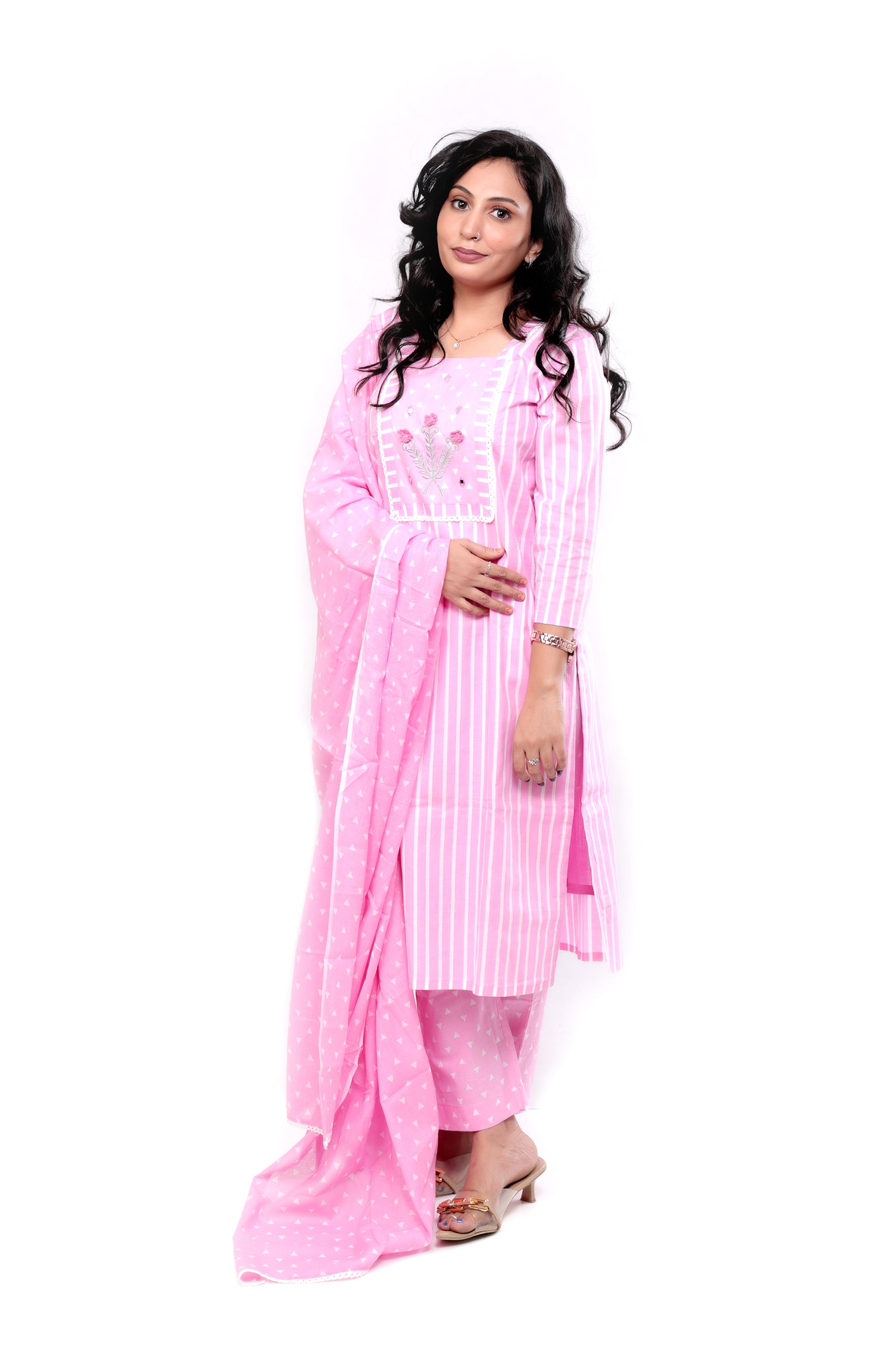 Indulge in the vibrant stripes and intricate embroidery on the neckline of this Cotton Striped Salwar set. Made from high-quality cotton, this set offers comfort and style with a touch of elegance. Perfect for everyday wear and special occasions. Experience effortless fashion with this must-have set!