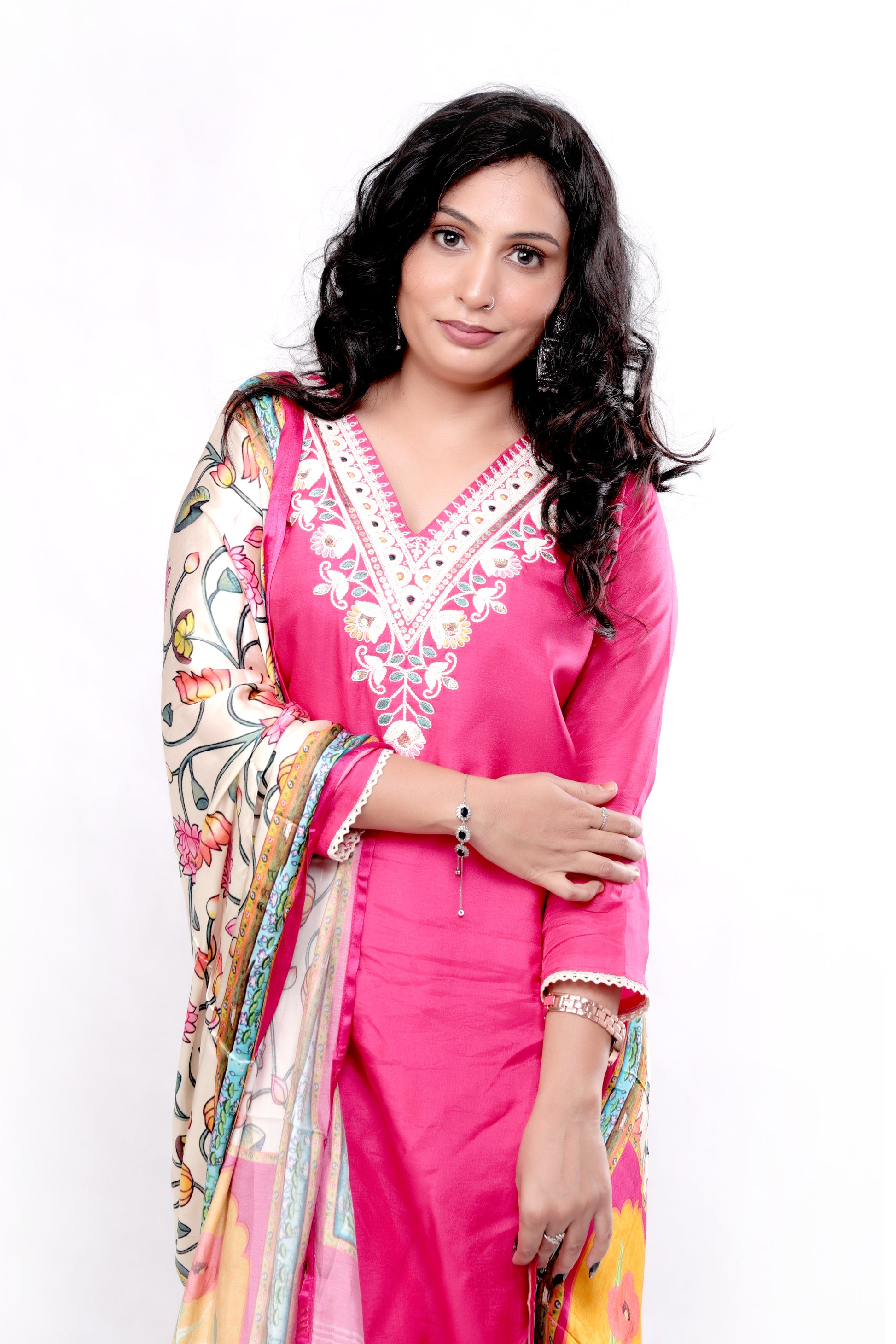 Step into timeless elegance with this Hot Pink Silk Salwar Set, a perfect blend of luxury and tradition. The kurta is crafted from premium silk fabric in a rich hot pink hue, highlighted by intricate embroidery with mirror accents around the neckline that adds a touch of shimmer and sophistication.