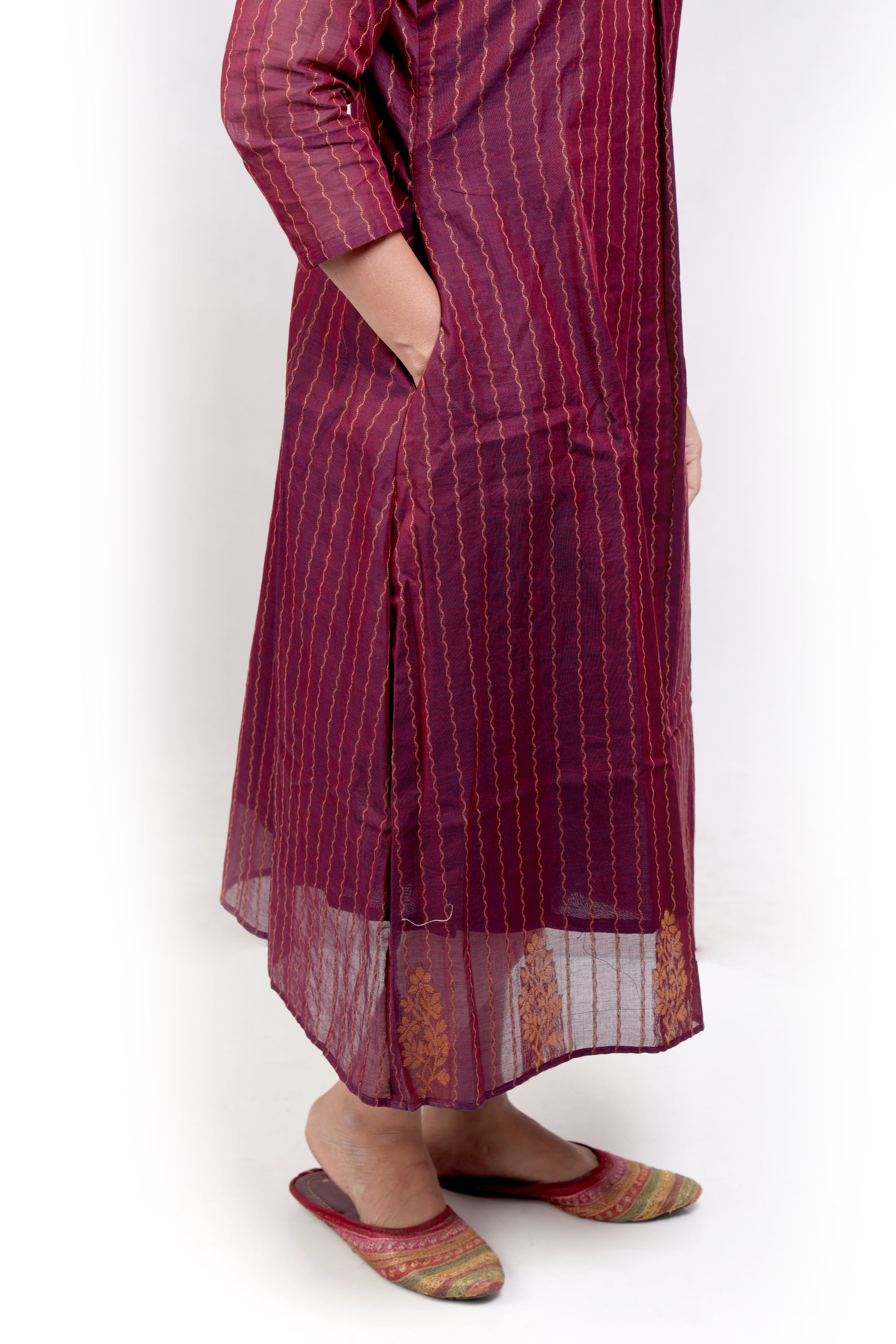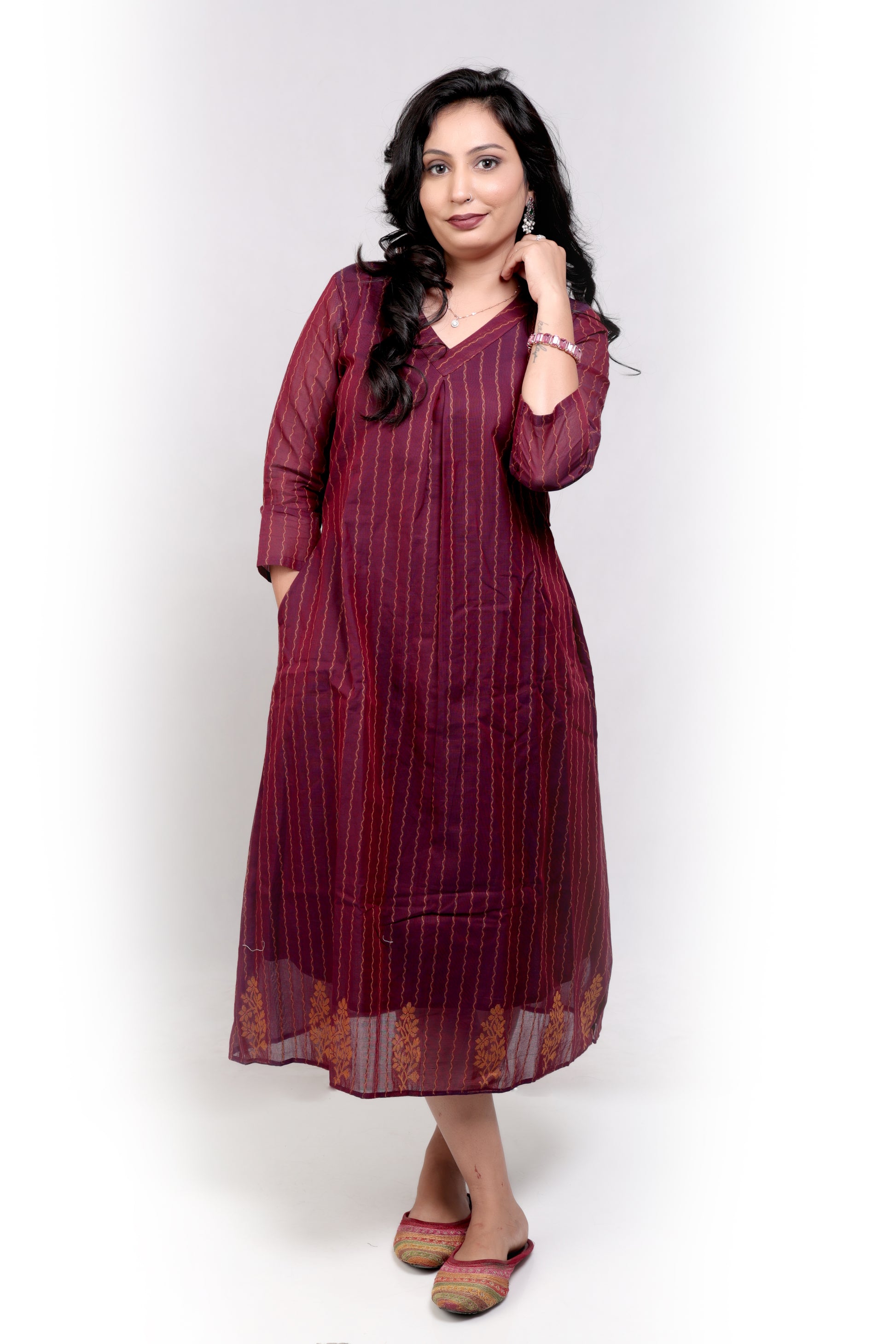 Designed to celebrate modern Indian femininity, the dress features fine vertical stripes and intricate motifs near the hemline, adding just the right amount of artisanal charm to your wardrobe.