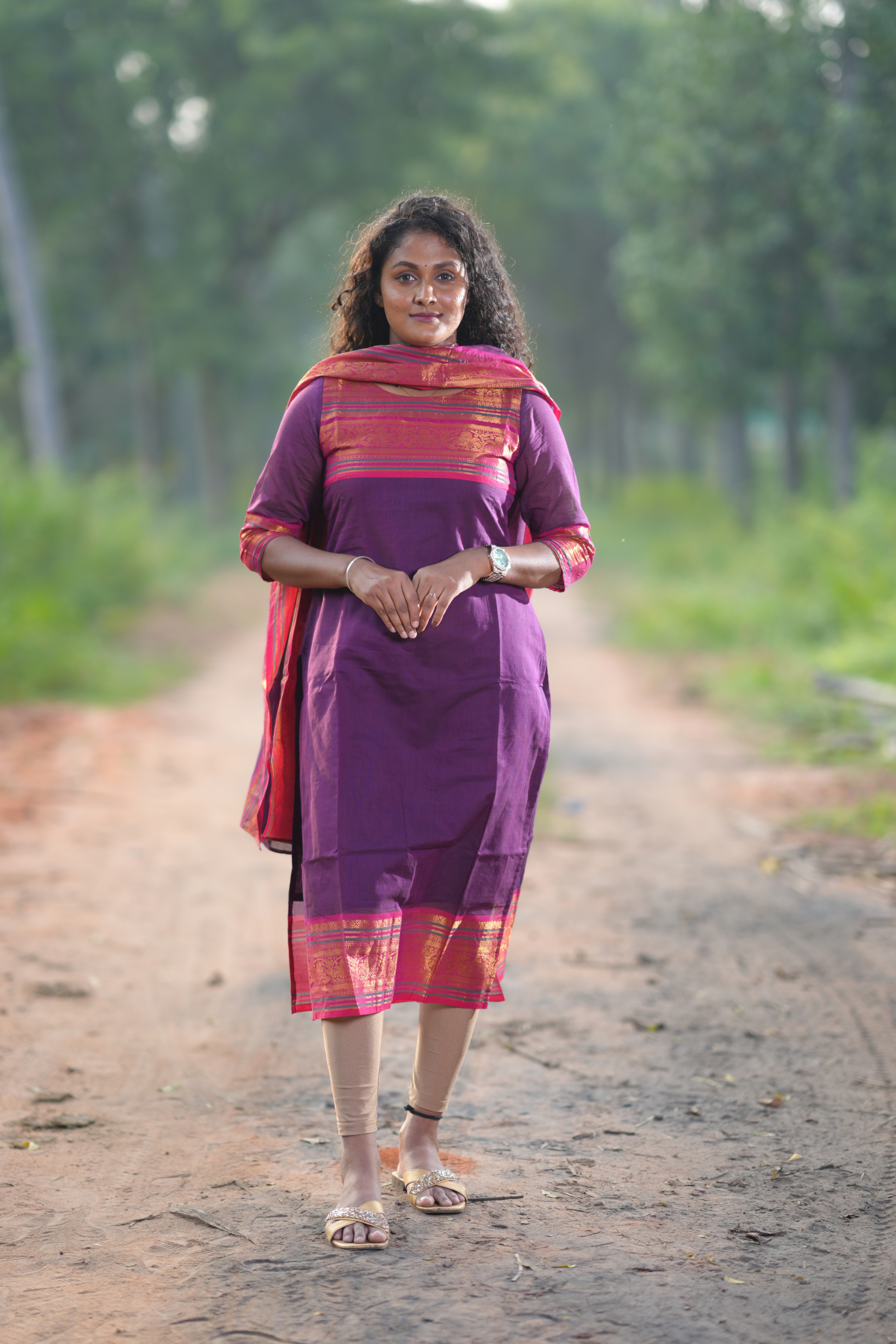 The kurta is beautifully enhanced with a rich pink and gold border along the sleeves and hem, reflecting classic South Indian artistry. Complementing it is a matching dupatta, adorned with intricately woven maroon borders that add depth, richness, and celebration to the look.